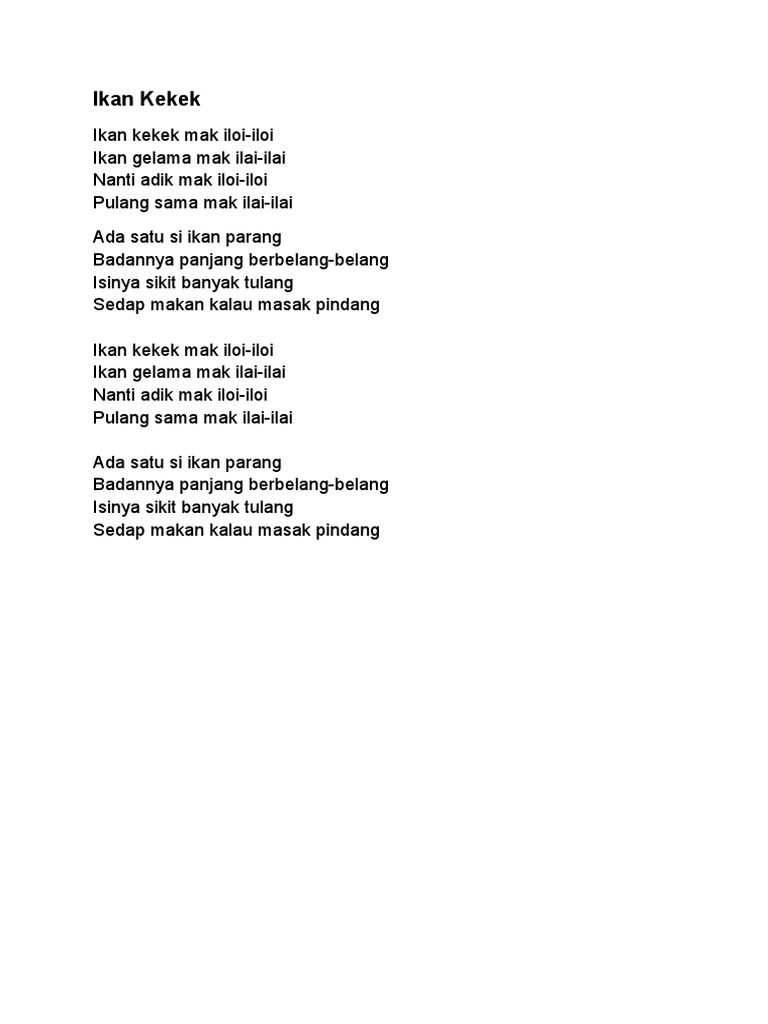 Ikan kekek mak iloi-iloi video ini dibuat menggunakan aplikasi stop motion sebagai tugasan kami untuk tutorial bagi subjek E-sastera dengan menggunakan lagu rakyat sebagai elemen utama. VERSE 2 timur barat utara selatan banyak budaya asal tempatan ke mana pun ku pergi di mana ku berdiri kan ku tetap bawa resmi padi jauh mana ku berlari dan. Apa yang ingin diperlihatkan pada entri ini bukan ikan kekek yang.