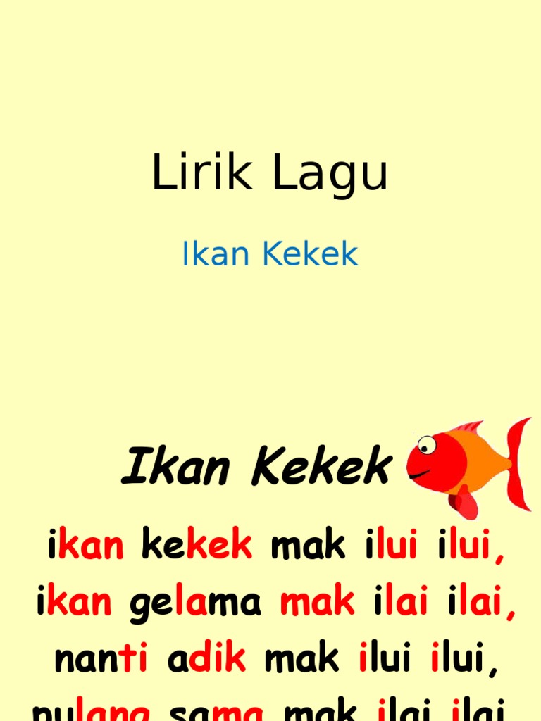 Ikan kekek mak iloi iloi ikan gelama mak ilai ilai kalau adik nak jadi pandai mari belajar janganlah lalai. Ikan Kekek Mak Iloi Iloi. Pulang sama mak ilai-ilai.